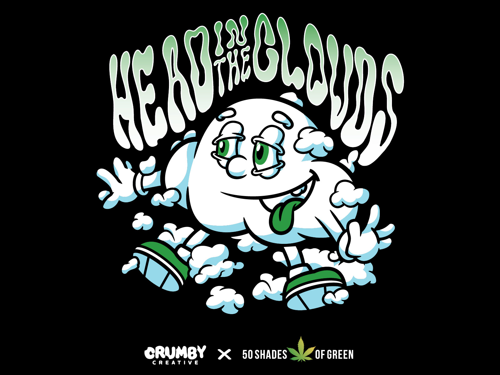 Client / Collaboration: 50 Shades of Green × Crumby Creative Services: Illustration, Character Design, Apparel Design Crumby Creative collaborated with 50 Shades of Green to create an original illustration that blends humor, attitude, and uplifting energy — both literally and figuratively. The concept, “Head in the Clouds,” features a mischievous cloud character brought to life in Crumby Creative’s bold, mascot-driven style. The design combines playful character art with dynamic typography, rendered in a clean, limited color palette of blues and greens to reinforce the lighthearted theme. The exaggerated expression, hand-drawn textures, and vintage-inspired lettering give the piece a nostalgic yet modern feel, ideal for apparel and lifestyle branding. This collaboration highlights Crumby Creative’s signature approach to illustration — fusing storytelling, personality, and style into art that’s equal parts collectible and wearable.