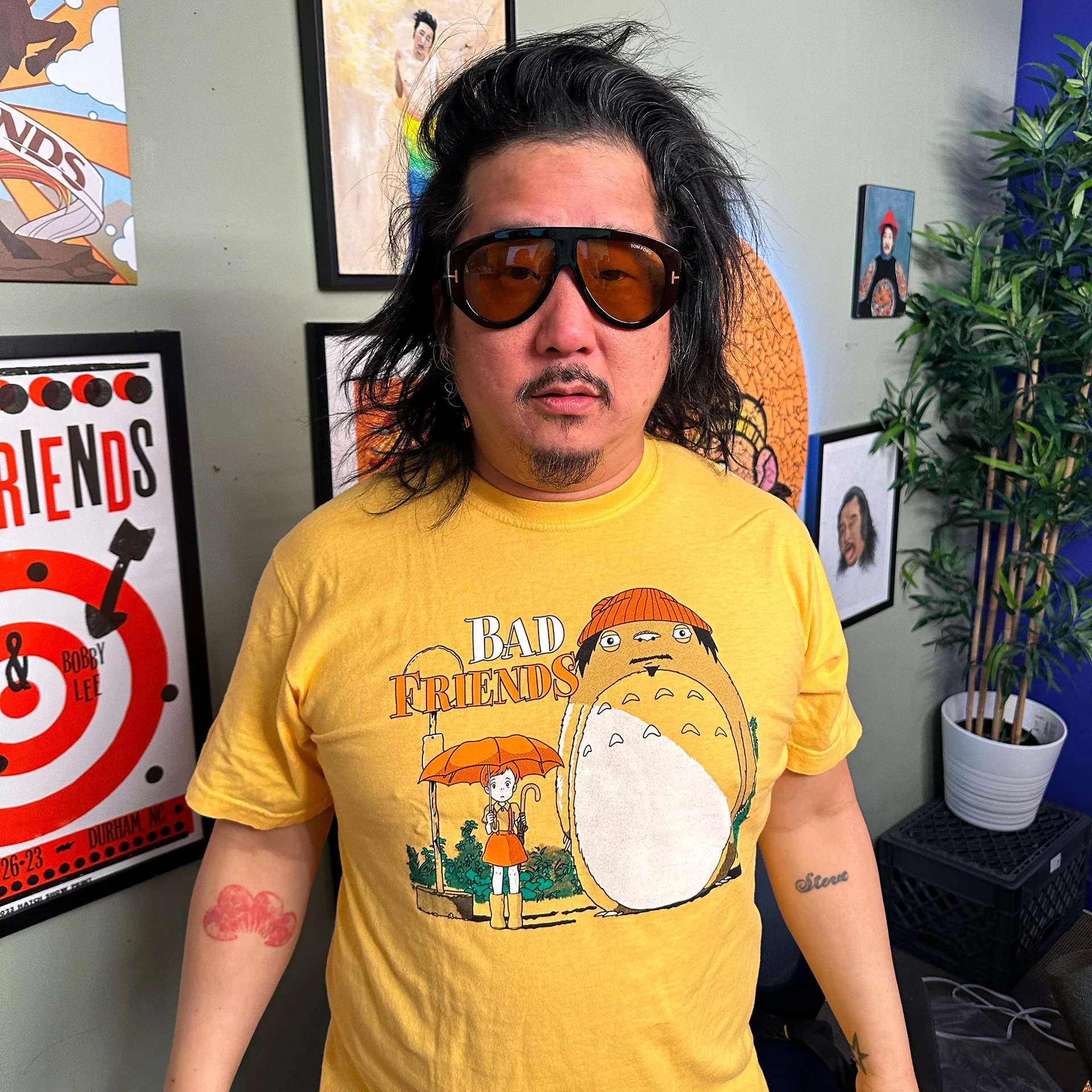 Client: Bad Friends Podcast × Drip Brands Role: Graphic Designer at Ink Alley Services: Illustration, Apparel Graphics, Character Design While working as a designer at Ink Alley, Crumby Creative’s Seth Ellenwood collaborated with Drip Brands and the Bad Friends Podcast team to create two original shirt designs for a head-to-head merch contest between hosts Bobby Lee and Andrew Santino. Each host’s shirt reflected their unique sense of humor and personality, with Seth providing the illustrated designs for both concepts. The project combined expressive illustration with bold, screen-print-friendly layouts that captured the chaotic, comedic energy of the show. Produced through Ink Alley’s print shop, the designs became fan favorites — showcasing the playful rivalry between the hosts and bringing the Bad Friends brand to life through standout apparel art.