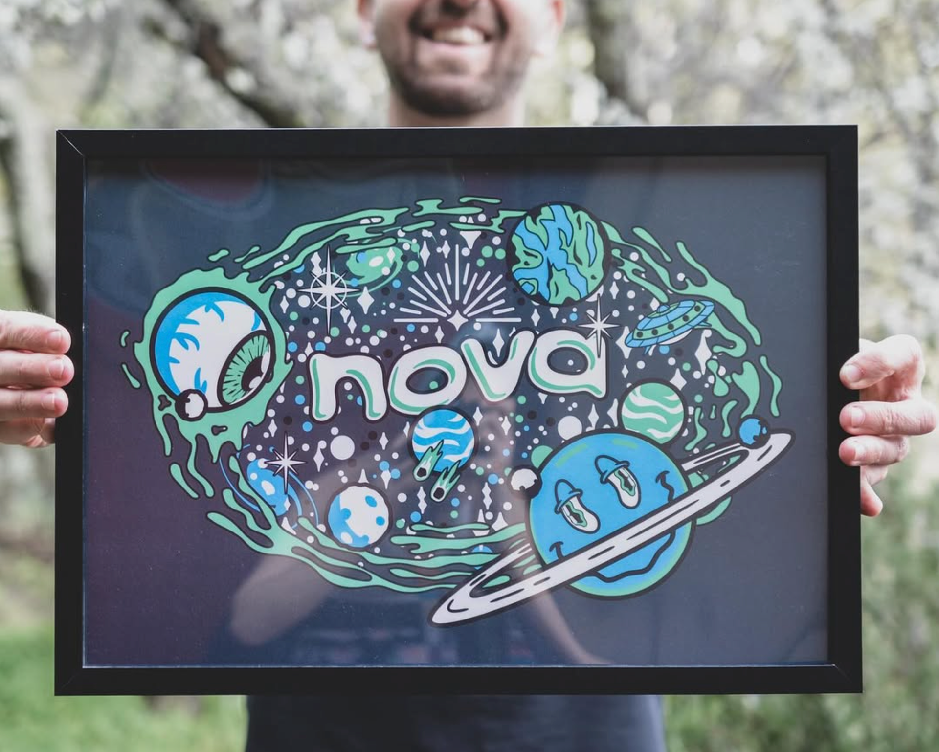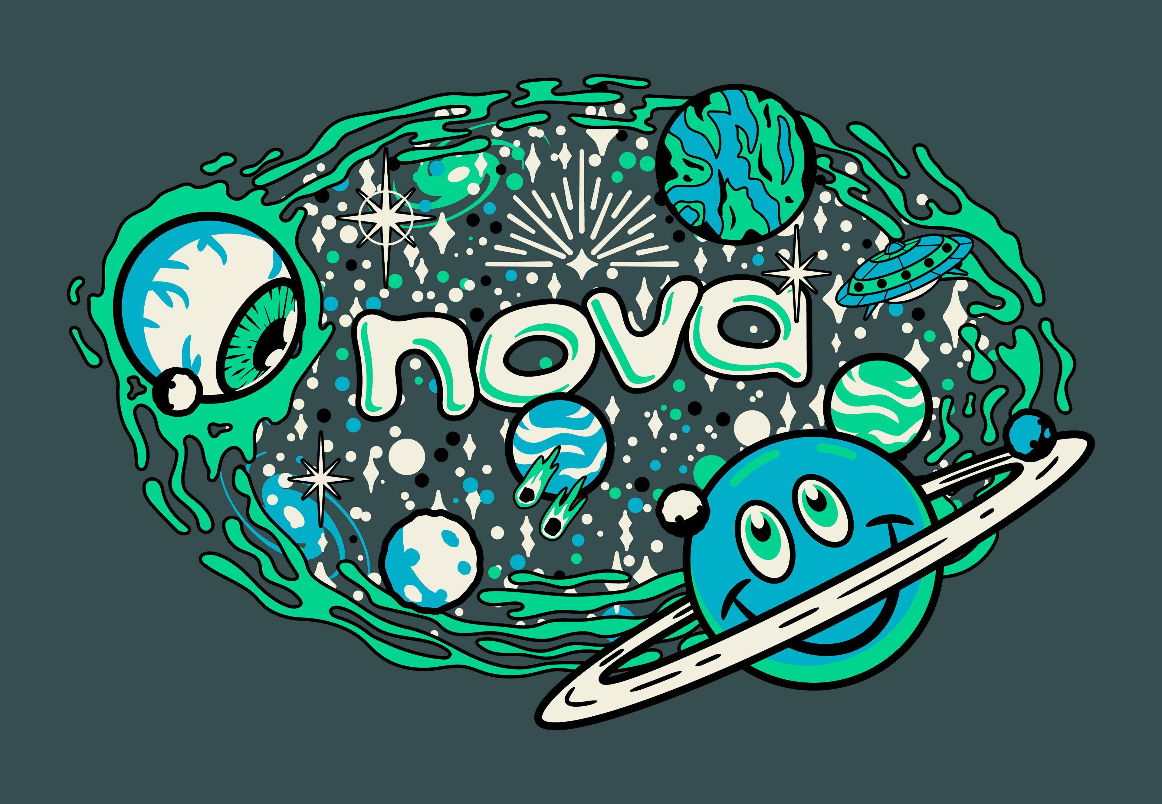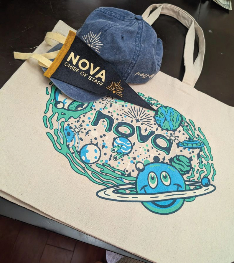 Client: Nova Chief of Staff Services: Illustration, Merchandise Design, Branding Support Crumby Creative partnered with Nova Chief of Staff to create a custom illustration and merchandise design that captured the company’s vibrant, imaginative culture. The final space-themed artwork centered around the Nova logo, surrounded by planets, stars, and galactic details, giving the brand a fun, approachable twist. Printed on tote bags and embroidered on hats, the design gave Nova a cohesive, character-driven look that reflected their “out-of-this-world” spirit.