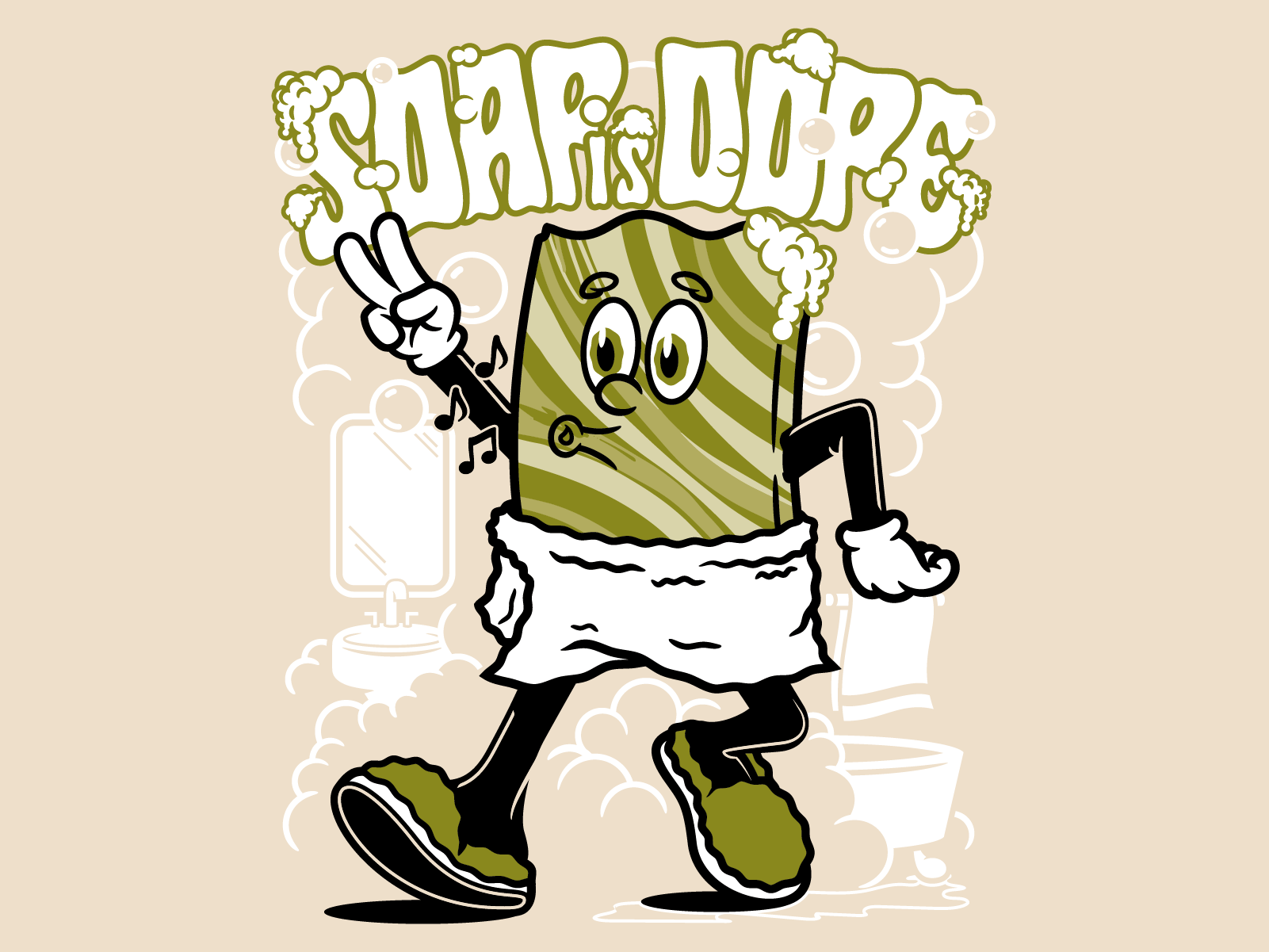 Client: Pacha Soap Co. Services: Illustration, Character Design, Apparel Design For Pacha Soap Co., Crumby Creative created a bubbly, vintage-inspired illustration that celebrates the brand’s fun, sustainable vibe. Featuring a cheerful soap bar character paired with expressive lettering, the “Soap Is Dope” design channels mid-century mascot energy and humor — proving that clean can be cool.